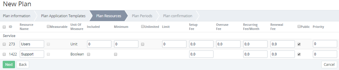 - In the Included field, enter the amount of the Resource which will be included in the Plan by default. The Included Resources prices are included in the Subscription price.