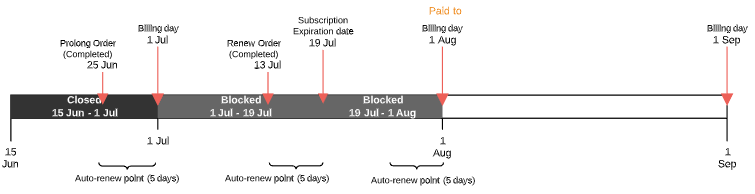 - If the Prolong Order is created before the Paid to date — from the first day of the next Billing period to the nearest date among the next Billing period end and the Subscription expiration date.