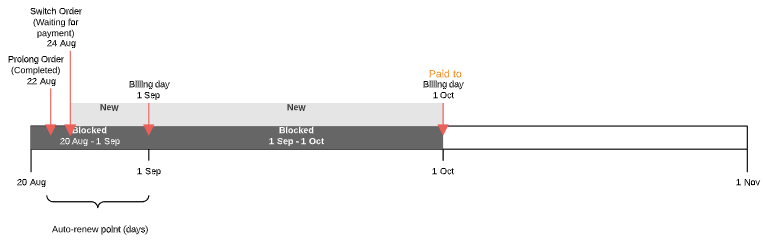 After completing the payment linked to the Prolong Order, the next Billing period Charge gets the Blocked status. The Paid to date is set equal to the next Billing day.