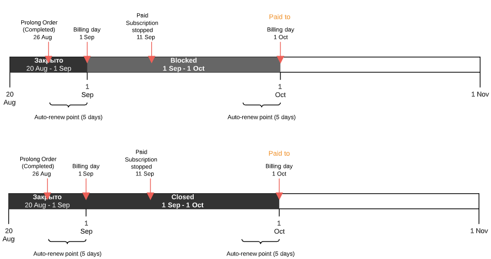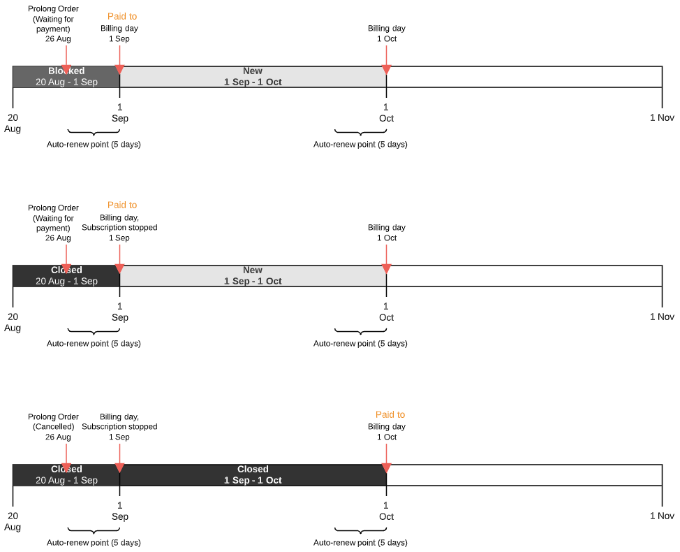 - If the Prolong Order is created before the Paid to date — from the first day of the next Billing period to its end or the Subscription expiration date (depending on which one is the nearest).