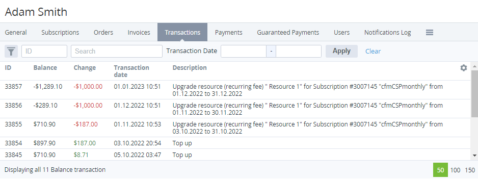 - Click the Transaction tab on the account details page. The list of Transactions is displayed.