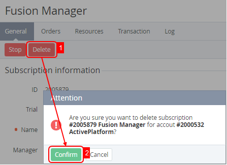 - Click Confirm in the pop-up window. In this example, the Subscription will have Deleted status.