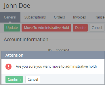 - Click Confirm in the pop-up window. The Account will be moved to administrative hold and will get Administrative hold status.