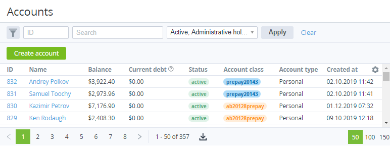 - Work permit for postpaid — permission of the Account to order postpaid Subscriptions (see Managing Account's permission to use the Postpay model). The column is displayed when the Allow an account to order a postpaid subscription parameter is set to Manually (see General system settings) and customers should get approval from their Managers to order postpaid Subscriptions. The possible values are: