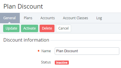 - Click the ID or Name link for the required Discount. The Discount details page is displayed (see Viewing and updating Discount details).