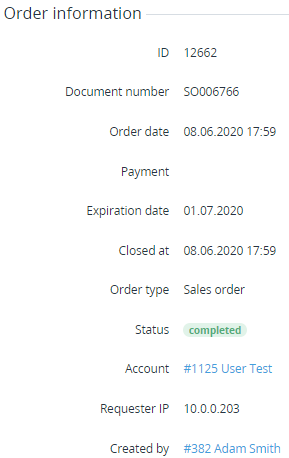 - Document number — Order number (for example, SO000329). The Order number templates are configured in the System settings (see System Settings).