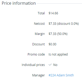 - Promo code — promo code used for the Order (see Managing Promo Codes) or, in case if the individual prices were set, the indication that the promo code is not applied.