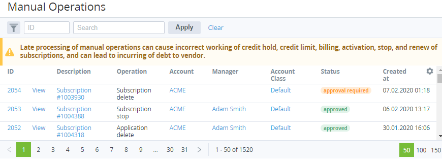- Account — name of the Account, which owns the Subscription requiring manual approval (see Viewing and updating Account's details).