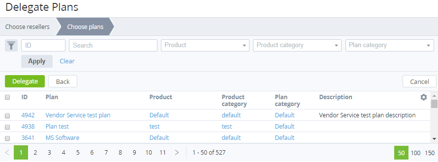 Click Delegate. The selected Plans will be delegated to the required Resellers.