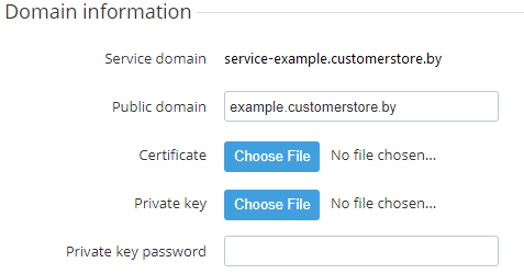 - Enter the existing public domain in the Public domain field in the Domain information group. It is to be used by customers to access the Customer Store.