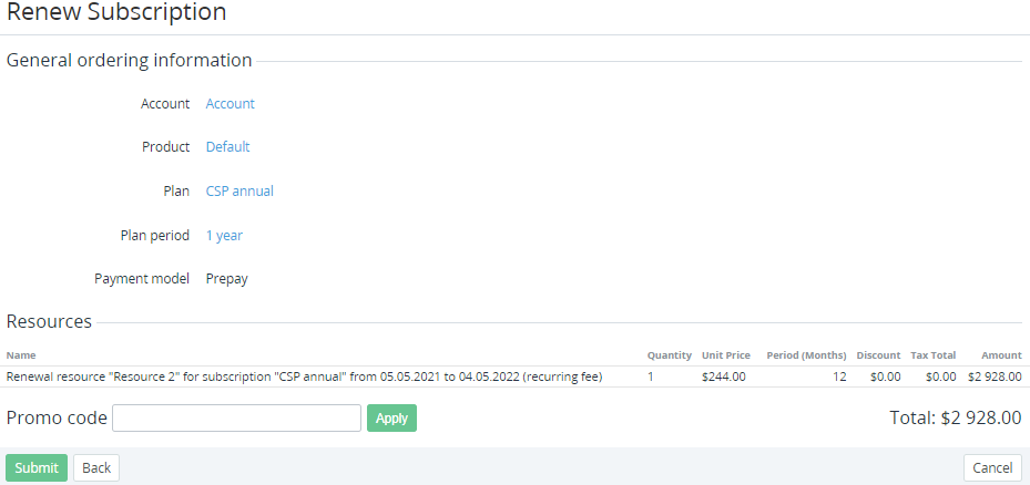 On the Renewal Subscription page, in the Plan period list, select the renewal period and click Next. The Renewal Order creation page with the Plan, Plan period, Subscription, and Resources information is displayed. For the elements description, see Ordering a Subscription at the Plan prices.
