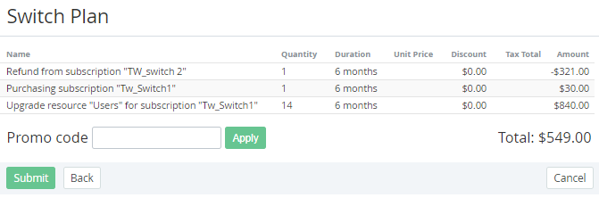 If the switchable Plan has common Resources with the previous one, the Total fields are prefilled with the Resources amount that were ordered for the previous Plan.