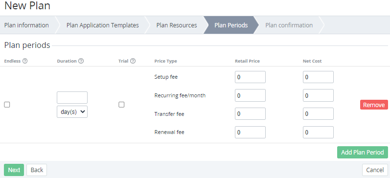 - For a trial Plan Period, select the Trial checkbox. A trial Plan Period cannot be endless. For customers, a trial Subscription is free, but they cannot upgrade the Resources or switch the Plan. For a trial Plan Period, no fees are required so it is possible to go to the step for adding another Plan Period.