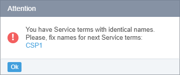 The warning message lists the names of the Service Terms to be fixed. In this case, the downstream Reseller should rename the listed Service Terms. The name of a Service Term in the warning message is a link to the corresponding Service Term details page (see Viewing and Updating a Service Term).