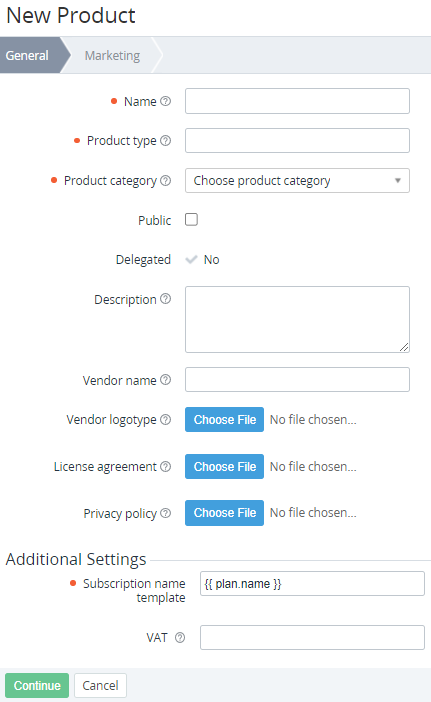 plan.name, and all Subscription names, excluding Subscription for Domains and Certificates, equal the names of corresponding Plans (see Default names of Subscriptions and Entry Points and Entry point configuration).Optionally, in the VAT field, enter information about VAT included in the cost of any Subscription to all Plans of the Product, up to 50 characters. This information is displayed for a Subscription in the Customer Control Panel (see Viewing Subscription details).