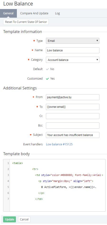 - Compare and Update — a page to compare the state of the Notification Template with its default state of with the state of the corresponding Template of the upline Reseller (see Updating and comparing a Notification Template).