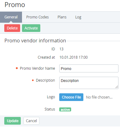 - Click the Activate button on the Toolbar. Promo Vendor gets the active status and the promo codes of this Promo Vendor will be issued to the Customers.