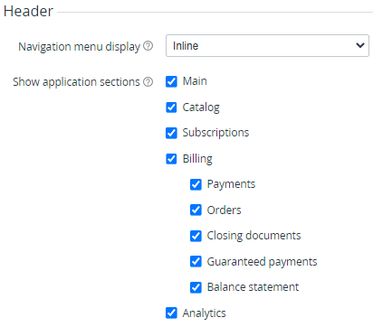 Additional settings is a tab for configuring the appearance of specific elements of the Customer Control Panel pages. These settings override any other. For example, displaying the navigation menu items defined in this tab has a higher priority than the Header section of the Design settings tab.