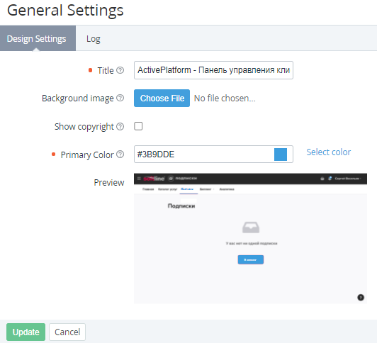 - Title — the common part of the title for all pages of the Customer Control Panel, up to 70 characters. Default: ActivePlatform - Панель управления клиента