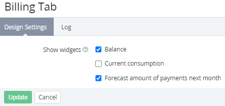 Billing tab is a section with the Show widgets settings to select widgets displayed in the Billing section of the Customer Control Panel (see Screen Layout):