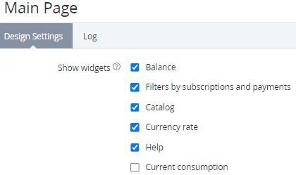Main page is a section with the Show widgets settings to select widgets displayed on the main page of the Customer Control Panel and the Help widget settings (see Screen Layout):