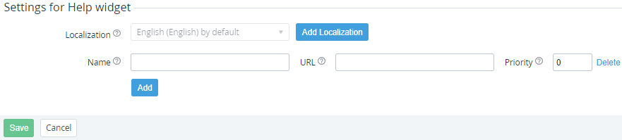 - Settings for Help widget is a subsection with the list of links displayed in the Help widget. For every language, the settings are displayed in the groups as follows: