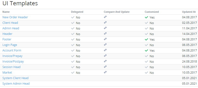 - Compare and Update — the column contains the link to the Compare and Update page to compare the state of the UI Template with its default state (for Operator) or the state of the corresponding UI Template of the upstream Reseller (see Comparing and updating a UI Template).