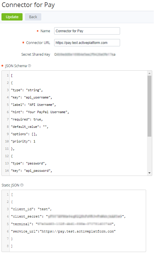 The process of updating Payment gateway connector's details is similar to it creating (see Creating a Payment gateway connector) except the following: