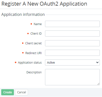 - On the Toolbar, click Create. The registration page of a new OAuth2 Application is displayed.