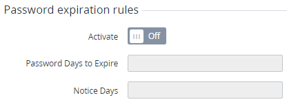 - To configure the expiration rules of the password, set the following options in the Password expiration rules group:
