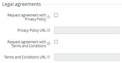 Request agreement with Privacy Policy — if the checkbox is selected, during the first sign in (see Signing in to the Customer Control Panel) and new User self-registration via the Customer Control Panel (see Short and full registration),the Privacy Policy agreement is prompted for a User. The User should agree to the Privacy Policy to start using the Customer Control Panel and complete the self-registration.