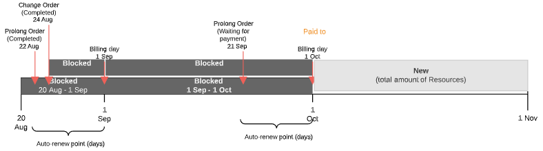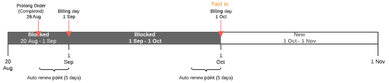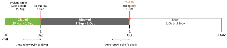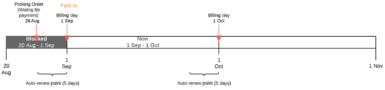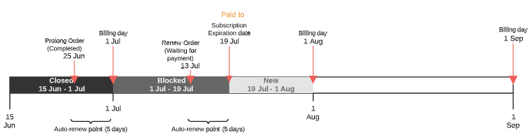 - If the Prolong Order is created before the Paid to date and the Subscription expiration date does not belong to the next Billing period — from the first day of the next Billing period to its end.