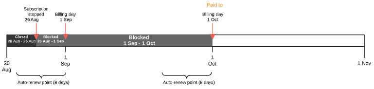 - A Charge in the Blocked status from the day after the stopping day till the next Billing day.