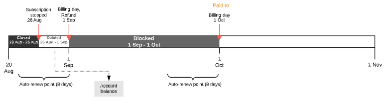 - The customer gets a refund to the Account balance for the period when the Subscription was stopped.