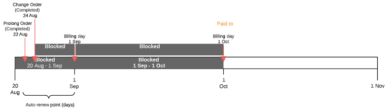 After completing the payment linked to the Prolong Order, the next Billing period Charge gets the Blocked status. The Paid to date is set equal to the next Billing day.
