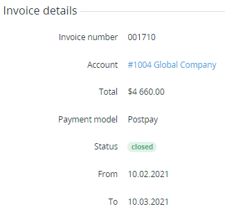 - Account — name of the Account, to which the Invoice was issued. It is a link to the Account page (see Viewing and updating an Account's details).