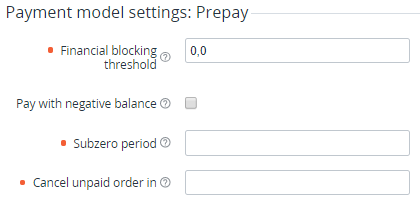 Optionally, select the Pay with negative balance checkbox to allow Accounts to pay for Orders with the negative Account balance within the limit set in the Financial blocking threshold field. For example, if theFinancial blocking threshold = 200 and Account balance = -10, an Account can pay from the Account balance for any Order with the amount up to 190.