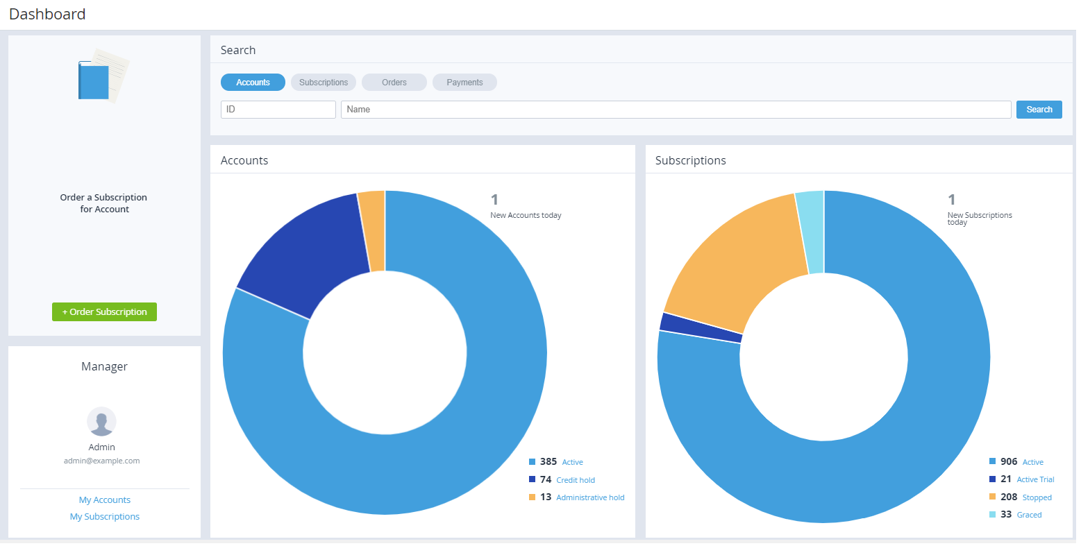 • Accounts and Subscription pie charts, providing information about Reseller's Accounts and Subscriptions (see also Viewing the list of Subscriptions and Viewing the List of Accounts).