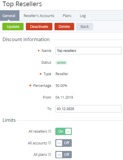 - Accounts or Reseller's Accounts — includes the list of Accounts that can use the Discount.