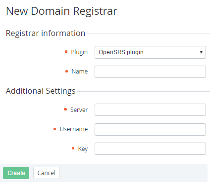 - Fill the fields in the Additional Settings group. The set of the fields depends on the Domain plugin, which was selected previously. For example, the following field must be filled if the OpenSRS plugin was selected in the Plugin list: