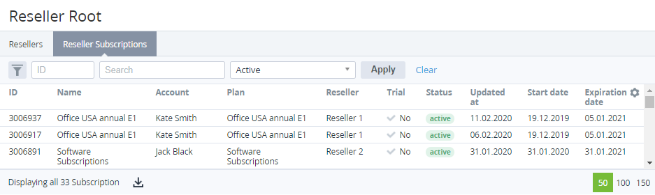 - The Manager column is replaced by the Reseller column. The Reseller column includes the name of the Reseller who sold the Subscription.