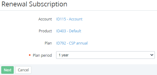 On the Renewal Subscription page, in the Plan period list, select the renewal period and click Next. The Renewal Order creation page with the Plan, Plan period, Subscription, and Resources information is displayed. For the elements description, see Ordering a Subscription at the Plan prices.
