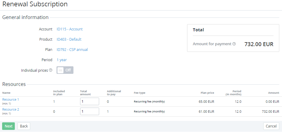 - On the Renewal Order creation page, for the required Resources, in the Total amount column, set the new amount.