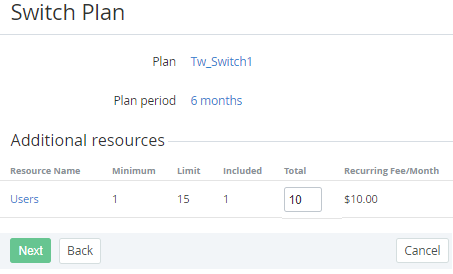 If the switchable Plan has common Resources with the previous one, the Total fields are prefilled with the Resources amount that were ordered for the previous Plan.
