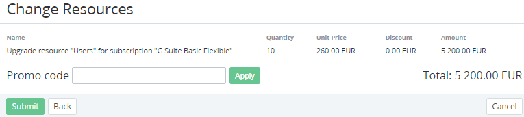 On the Change Resources page, check the Order details. If you have a promotion code (see Creating a Promo Code manually), enter it in the Promo Code field to set a discount.