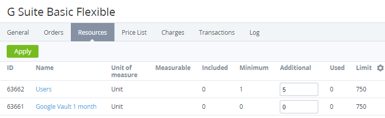 In the row with the required Resource, in the Additional field, enter the new number of the additional amount of the Resource. The total Resource amount is equal to the sum of the Additional and Included values.