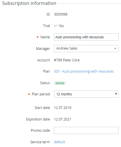 - Promo code — a field that can be used to get a discount on the current Subscription (see Managing Promo Code Discounts).