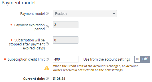 - Payment model — the payment model set in the Account Class, unavailable for changing.