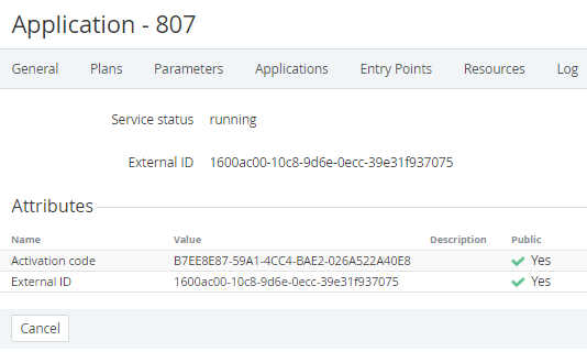 Click the ID or Name of the Application Instance. The details page of the selected Application Instance is displayed. The Application Instance attributes store values of parameters for a certain Subscription. The content of the page depends on the type of the Application Template.