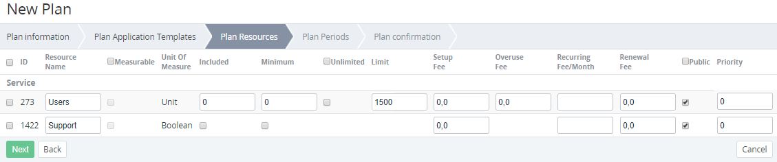 - In the Included field, enter the amount of the Resource which will be included in the Plan by default. The Included Resources prices are included in the Subscription price.